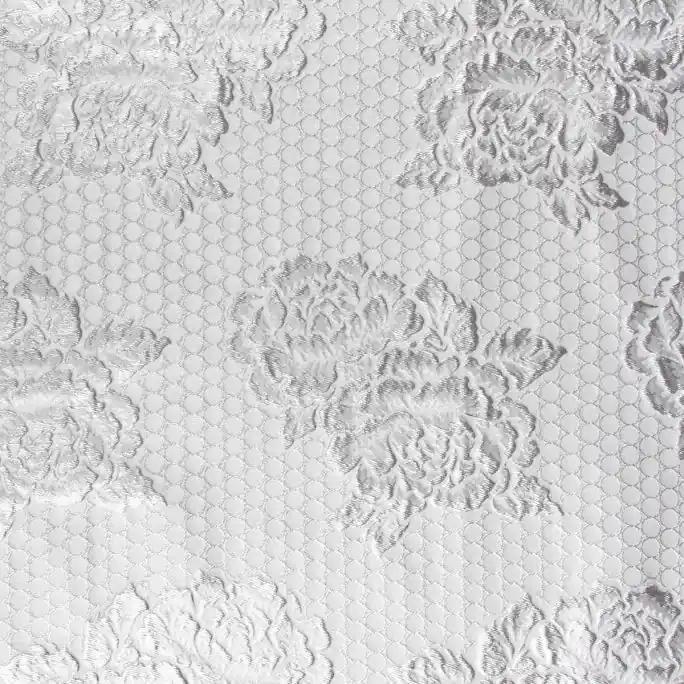 Prachtige stevige kwaliteit jacquard met zilveren geweven bloemen, op een witte achtergrond met circelpatroon. Deze sfeervolle, luxe jacquard is zeer geschikt voor kussens, jurken, blazers of kostuums.