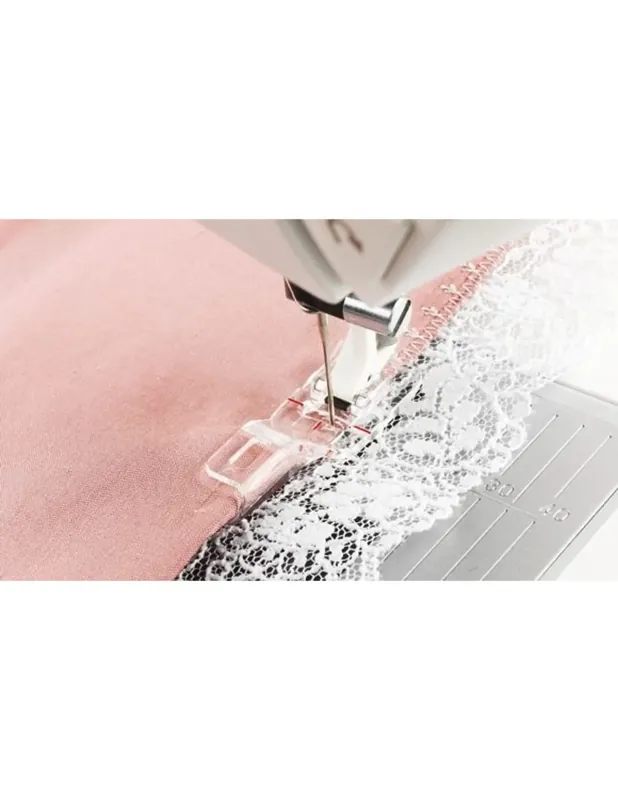 Of gebruik de voet om in combinatie met verschillende stoffen en de prachtige HUSQVARNA VIKING® 7 mm steken prachtige randen te maken. Zo maakt u in een handomdraai lingerie, prachtige zakdoeken met kanten randjes of elegante tafelkleden. Deze naaivoet geleidt de rand en de basisstof soepel door de openingen in de voorkant van de voet, vouwt de basisstof en naait de rand tegelijkertijd vast.