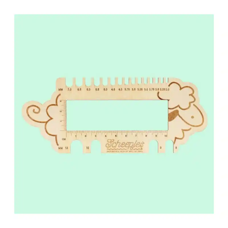 Deze Scheepjes brei- en haaknaaldenmeter in de vorm van een schaap is een erg handig en veelzijdig hulpmiddel om de maat van uw brei- of haaknaalden te bepalen. De meter is vooral onmisbaar bij breinaalden zonder knop of rondbreinaalden zonder maataanduiding, maar is ook handig wanneer de maataanduiding op een naald vervaagd is door veelvuldig gebruik. De brei- en haaknaaldenmeter is gemaakt van hout en is te gebruiken om naalden van 2.00-12.00mm te meten. De Scheepjes brei- en haaknaaldenmeter schaap heeft bovendien een uitsparing in het midden met een breedte van 10cm en een hoogte van 3 inches, wat ideaal is voor het opmeten van een proeflapje om uw stekenverhouding te bepalen.