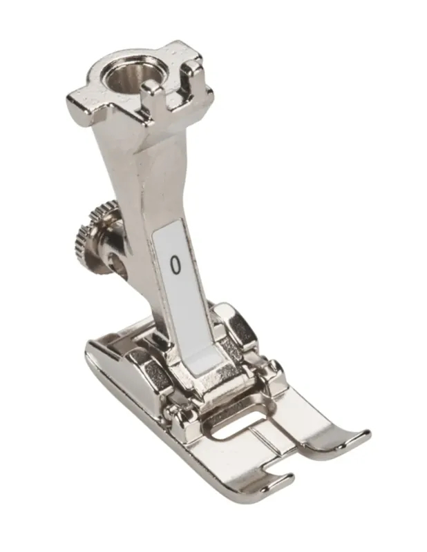 Door een gleuf kan het garen bij de zigzagvoet #0 makkelijk naar achter gevoerd worden. Voor slecht geleidende materialen is deze ook met glijzool #52 verkrijgbaar.