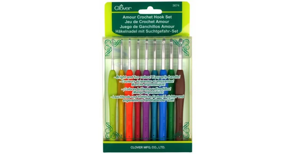 De Clover Amour haaknaald is glad en glijdt moeiteloos door de steken. Het afglijden van lusjes gaat ook gemakkelijk en snel met de afgeronde vorm van de haak. Met verschillende kleuren worden de diktes aangeduid, zodat het zoeken naar de juiste naalddikte erg eenvoudig is.