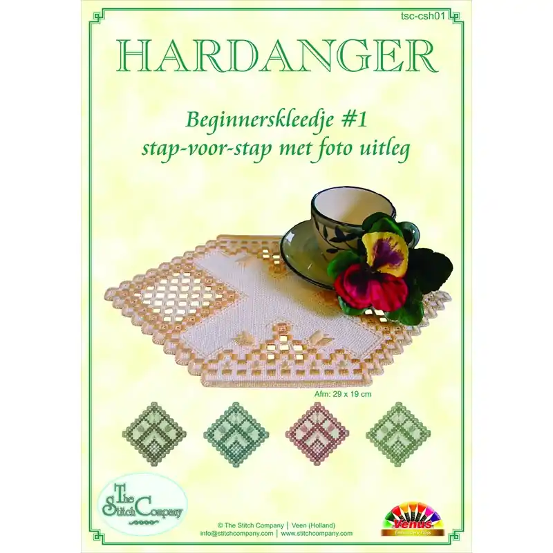 Compleet beginnerspakket #1 voor Hardanger met stap-voor-stap-foto-uitleg om het afgebeelde kleedje te maken.