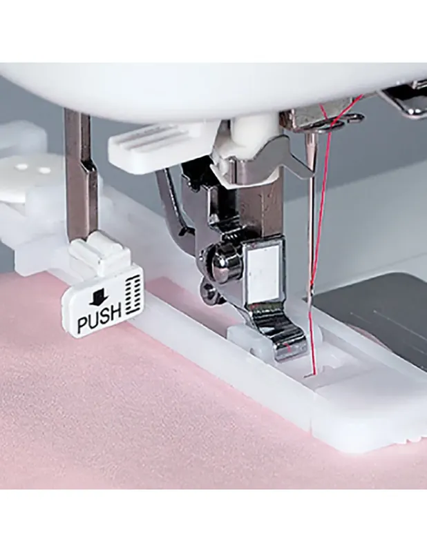 De knoopsgatvoet wordt gebruikt voor het automatisch naaien van knoopsgaten. Plaats hiervoor een knoop in de knoophouder van de knoopsgatvoet.