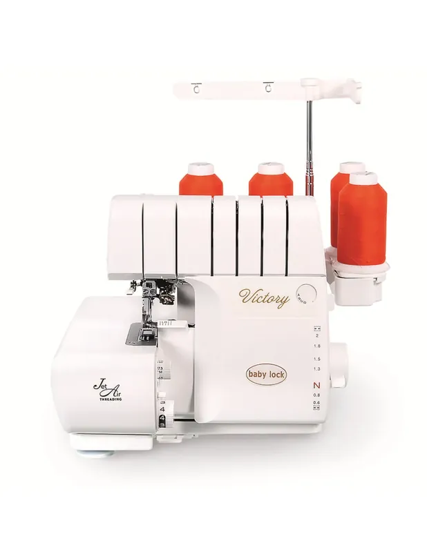 De Babylock Victory overtuigt door zijn eenvoudige en comfortabele bediening. Daarmee krijg je prima overlockresultaten. Het door baby lock zelf ontwikkelde Jet-Air™ threading-systeem helpt bij het inrijgen van de grijper. Geleid de draad in het grijperkanaal en druk op de hevel. De draden worden direct met luchtdruk in de grijper geregen.