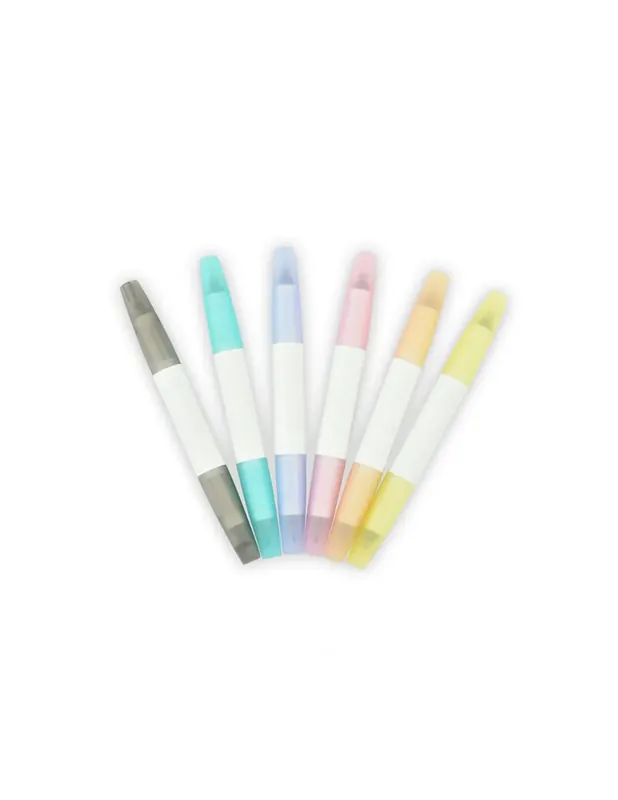 Twee pennen in één! Elke pen heeft een fijne punt van .4 mm en een vilten punt van 2,5 mm. Perfect voor projecten met verschillende lijndiktes. 6 markers in de set.