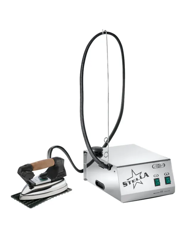 Stoomgenerator compleet met stoom strijkijzer, dubbele veiligheidsklep, automatische ketel met pomp en ingebouwd waterreservoir, RVS ketel van 1.3 lt. netto inhoud, vermogen ketel 1150W.