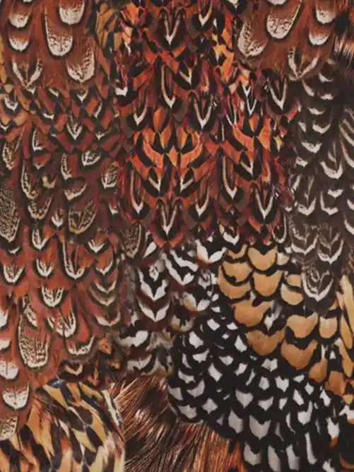 Deze digitale velourse stof heeft een vrolijke opdruk van verschillende soorten veren. Een mooie soepele stof voor bijvoorbeeld een gordijn.