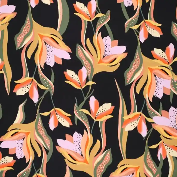 Schitterende kwaliteit viscose met een satijn glans. Deze stof is bedrukt met een prachtig tulpen motief. Viscose neemt goed vocht op bij warm weer en blijft luchtig aanvoelen. Zeer geschikt voor soepele rokken, broeken, jurkjes en blousen.