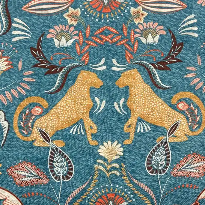 Deze mooie kwaliteit poplin is een 100% katoenen stof met een prachtige blauwe print met ornamenten en panters. De stof voelt zacht aan en is zeer geschikt voor het maken van kleding maar zeker ook voor decoratie zoals een mooie sierkussen.