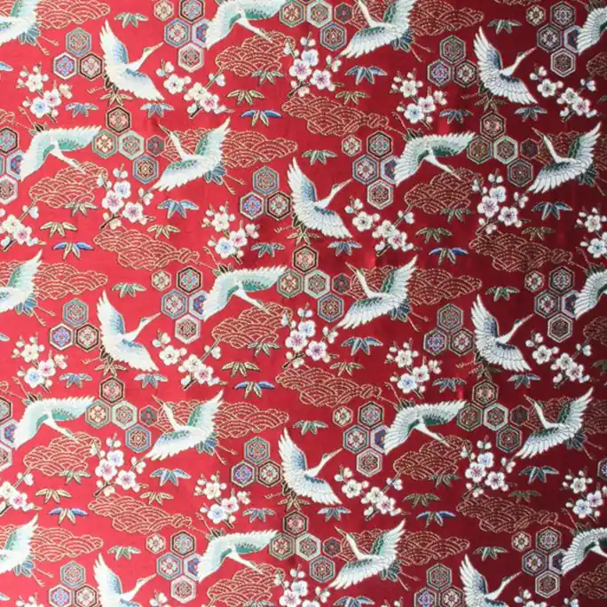 Schitterende, hoogwaardige kwaliteit gobelin jacquard. Deze prachtige, sfeervolle en soepel vallende stof heeft een uniek Aziatisch geïnspireerd design van bloemen en ooievaars. Zeer geschikt voor sierkussens, gordijnen of bekleding van een poef, krukje of stoeltje.