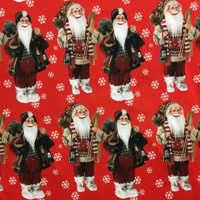 Mooie kwaliteit soepel vallende tricot katoen met kerstmannen print. Een vrolijke stof, geschikt voor kinderkleding, bijvoorbeeld een kerst pyjama, maar ook als decoratiestof.