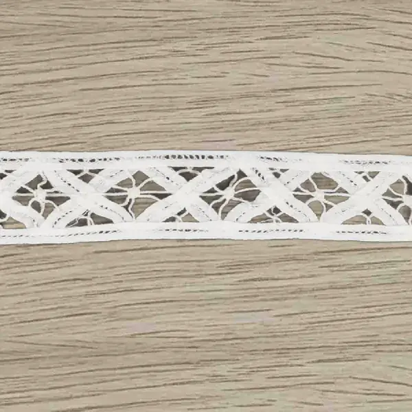 Dit grafische witte kant is perfect voor het afwerken en decoreren van tafelkleden, kleding, accessoires en gordijnen.