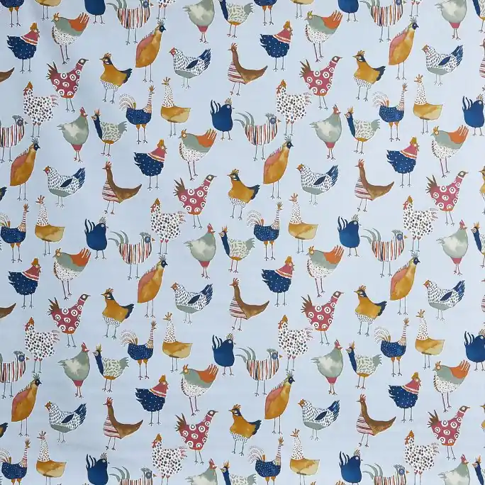 Zeer mooie, zware kwaliteit 100% katoen met vrolijke, gekleurde kippen. Een schitterende stof die uitermate geschikt is voor kussens, (kinder)gordijnen, tafellakens enz.